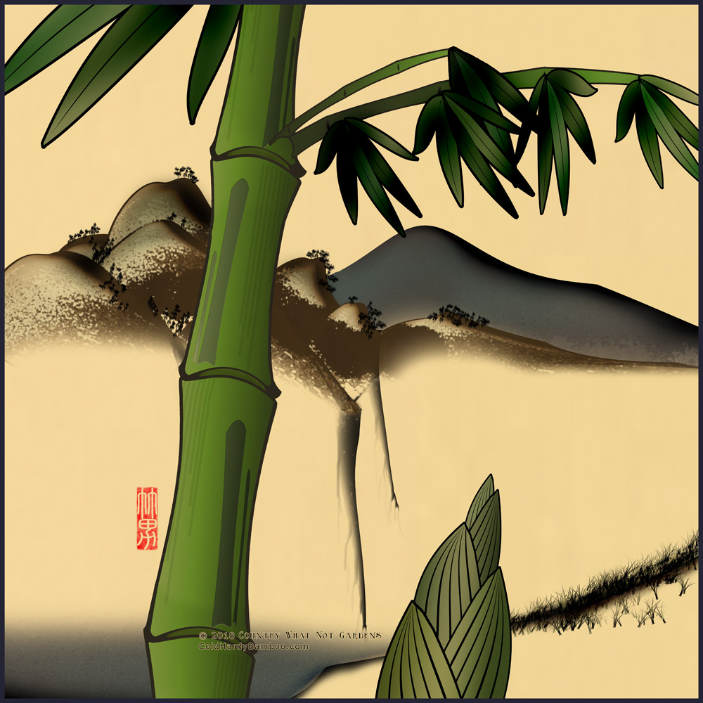 This design is reminiscent of and inspired by vintage Japanese woodblock prints. It features a bamboo culm and shoot framing a picturesque mountain scene.