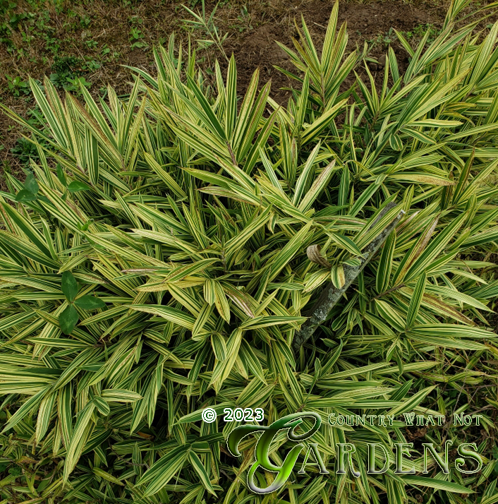 This beautiful variegated bamboo makes a great ground cover. It should be mowed to the ground early each spring before shooting to make way for the bright new growth. The old growth can look a little ragged after winter.